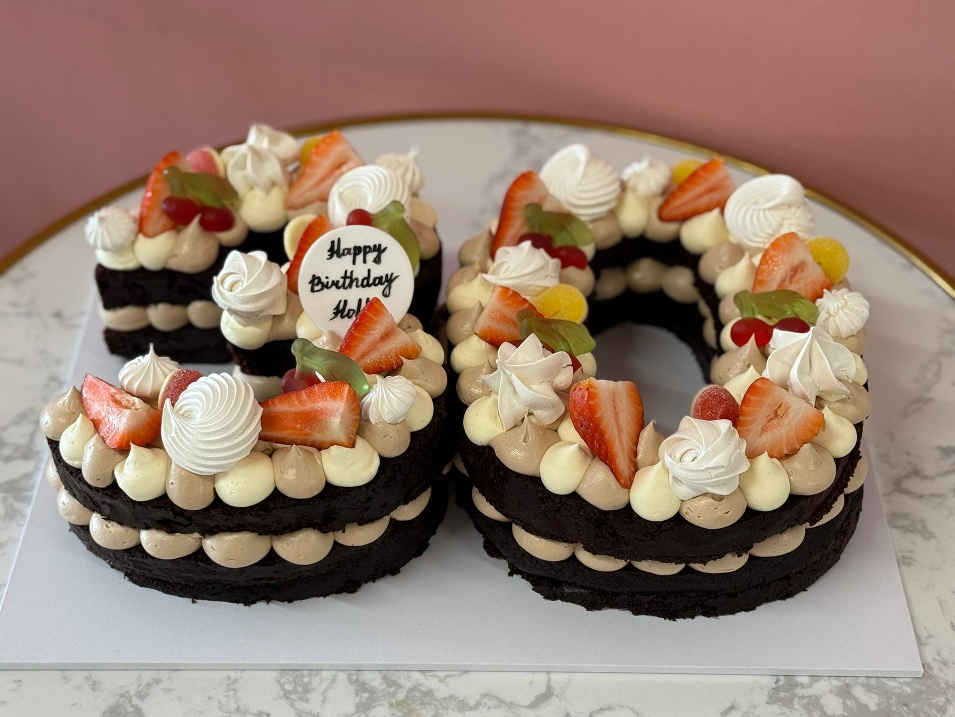 Our number cakes are a tasty way to show off that big milestone. Our cakes are 2 layers filled with buttercream and filling. Each number is topped with handmade macarons, meringues, chocolate strawberries, flowers and sweets.